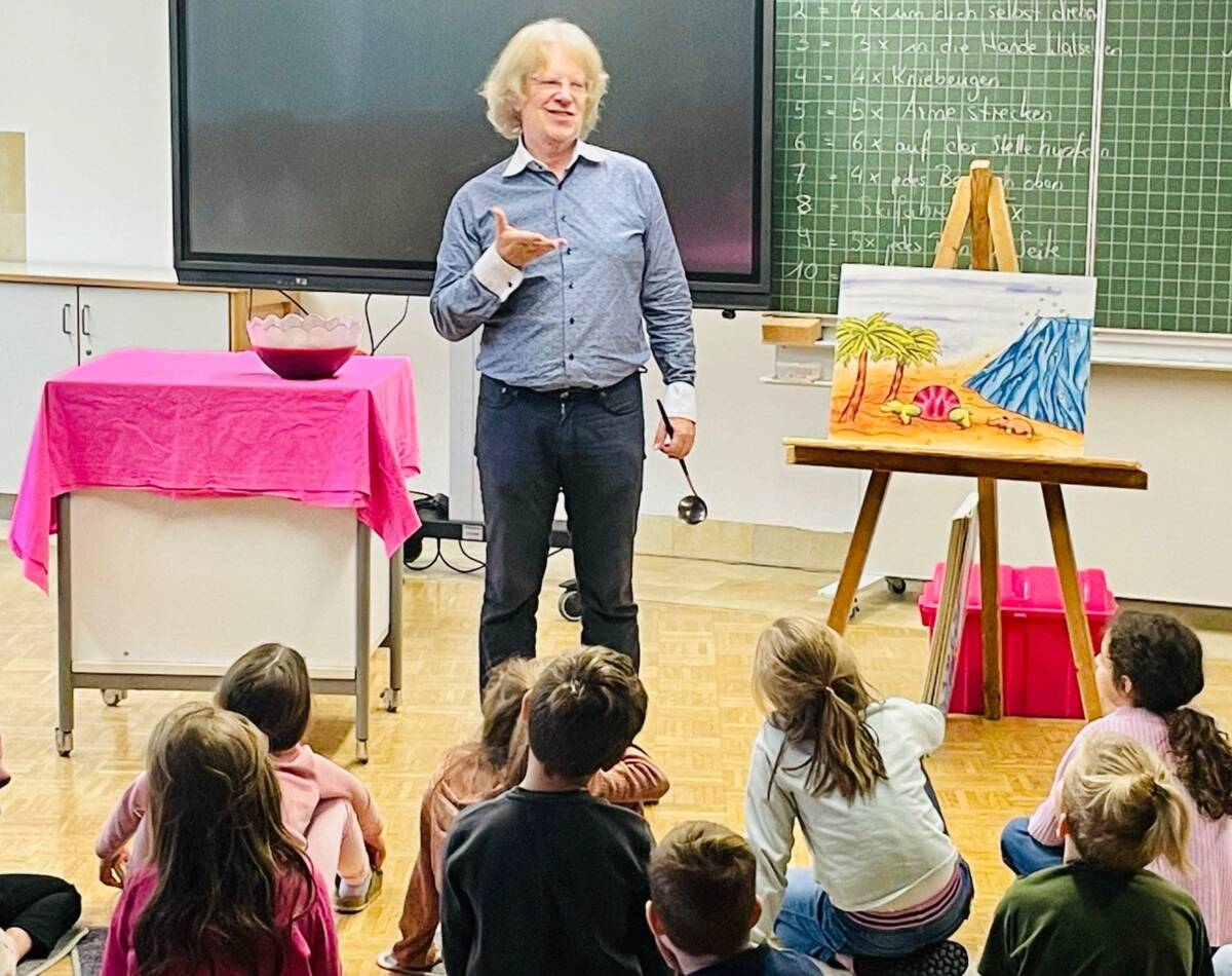 Fantasie und Vorstellungskraft kennen keine Grenzen. Dies vermittelte der Kinderbuchautor Andreas Dietz seinen Zuhörern von der 1. bis zur 3. Klasse an zwei Vormittagen. Eingangs erläuterte der Maler, Künstler und Kinderbuchautor aus Passau, wie seine Bücher entstehen. „Zuerst habe ich mir eine Geschichte ausgedacht, dann aufgeschrieben, Bilder dazu gemalt und in der Druckerei ist dann das Buch entstanden“, zählte er die Schritte auf. Anschließend trug er mit Hilfe seiner großformatigen Bilder und eindrucksvollem schauspielerischem Können seine Geschichten vor. Dietz bezog seine Zuhörer direkt in das Geschehen mit ein, was darin endete, dass jedes Kind einen Zaubertrank probieren durfte. Eine von der ersten bis zur letzten Minute der Lesung aufmerksame Zuhörerschaft dankte es ihm. Besonders ansprechend waren auch die Malvorlagen, die Andreas Dietz für jedes Kind eigenhändig stempelte.