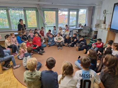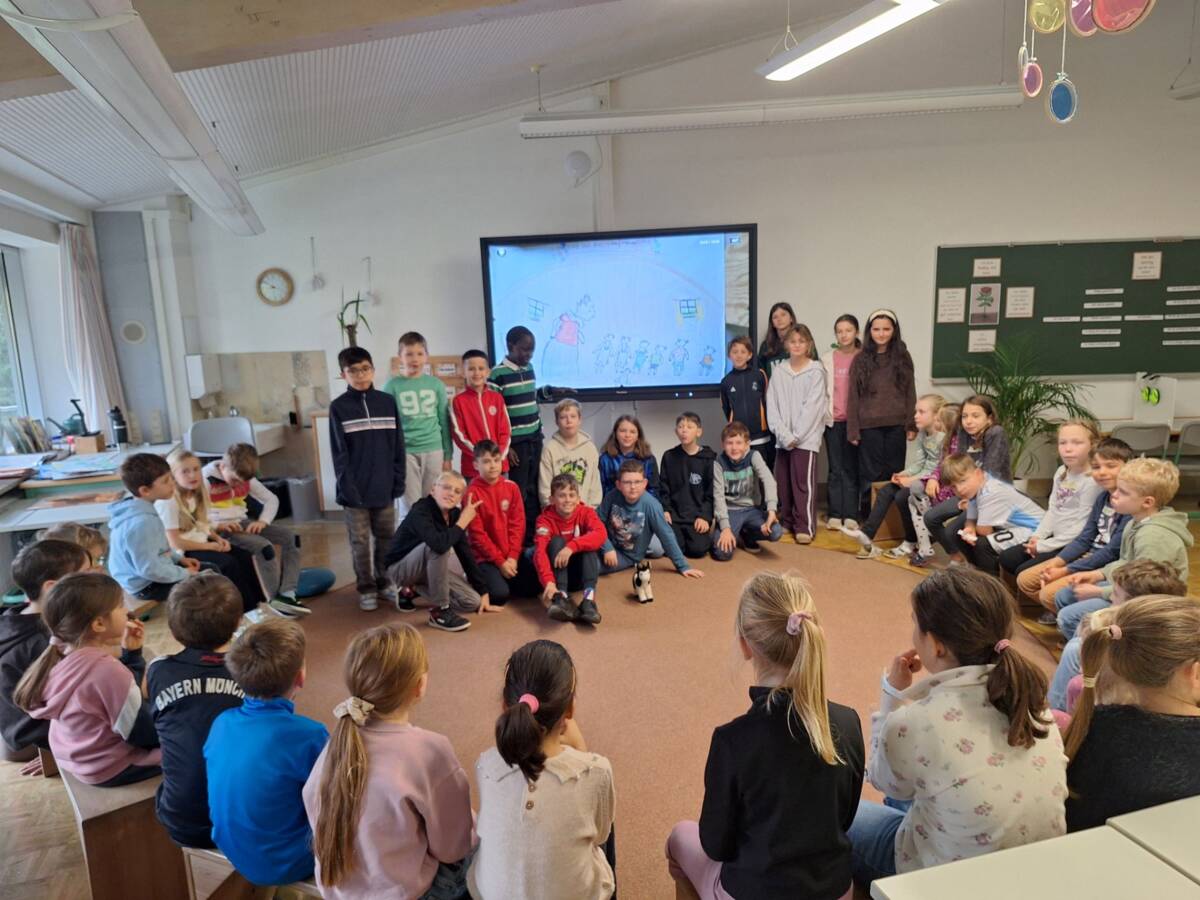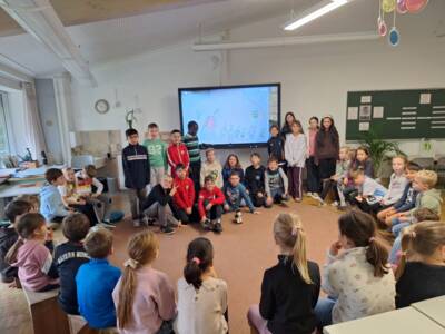 Die Kinder der 5. Klasse bereiteten sich lange vor: Sie lernten Texte, malten Bilder und feilten an ihrer Stimme. Im Mittelpunkt stand eines der bekanntesten Tiermärchen aus der Sammlung der Gebrüder Grimm „Der Wolf und die sieben jungen Geißlein“. Voller Vorfreude und mit ein bisschen weichen Knien fuhren wir als Märchenerzähler nach Kronwinkl, wo unser Publikum, die Klasse 2b, schon gespannt auf uns wartete. Wie echte Profis ließ sich keiner die Aufregung anmerken, die Bilder kamen super an und die Texte saßen perfekt. Frau Cihaber meinte anerkennend, sie habe ihre Klasse noch nie so ruhig erlebt. Auch Herr Lang kam als Überraschungsgast vorbei. Nach der Vorstellung schnappte sich jeder Zweitklässler einen tapferen Helden und Groß und Klein lasen oder spielten gemeinsam.