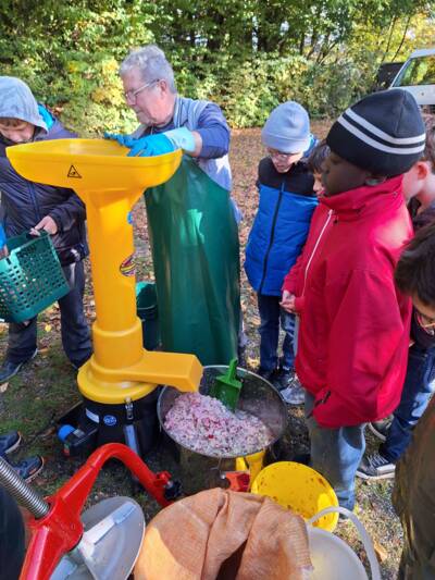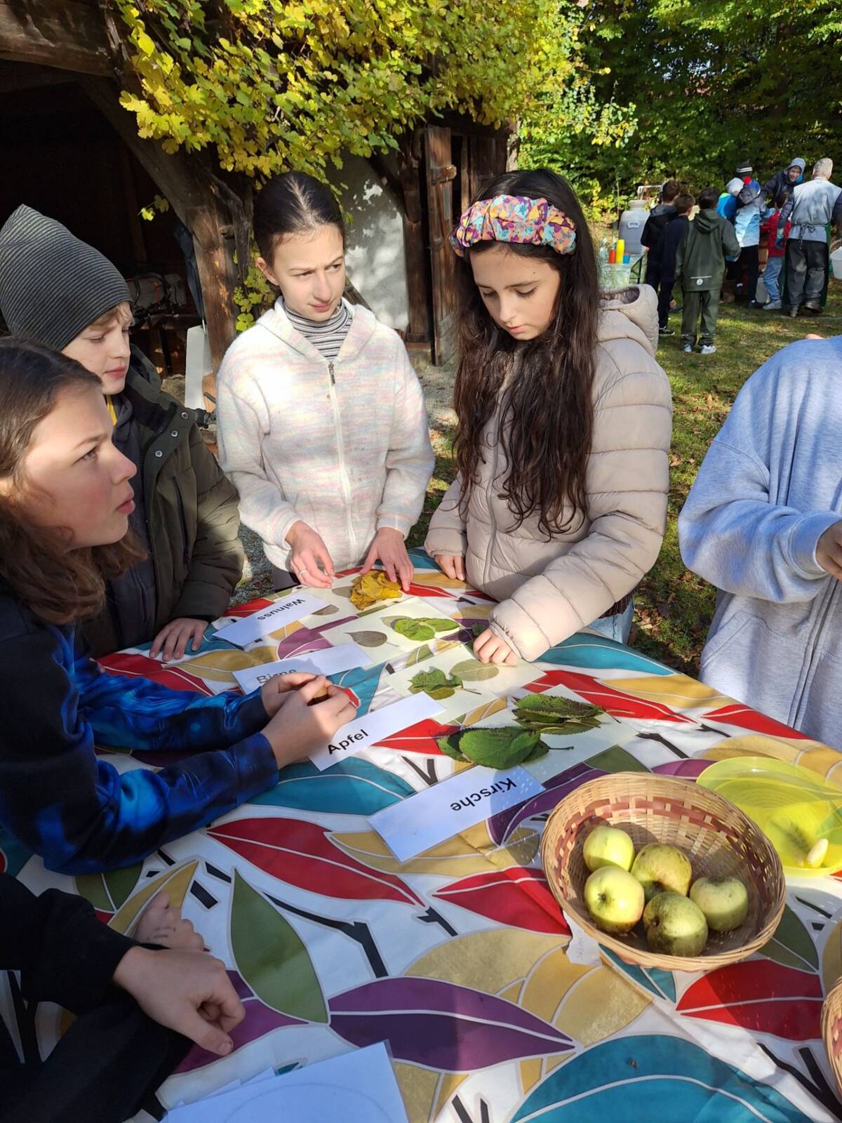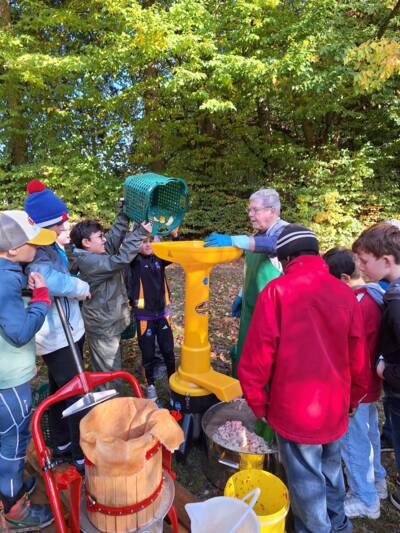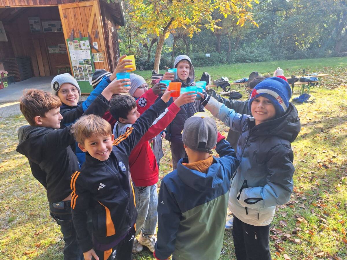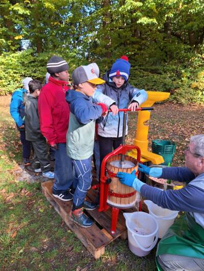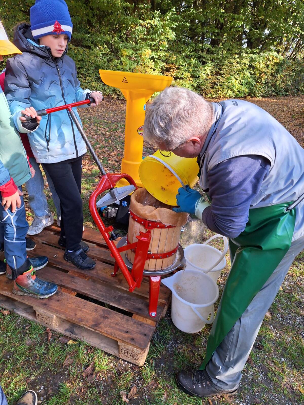 Bei herrlichstem Herbstwetter mit bunten Blättern, strahlend blauem Himmel und Sonnenschein hatten sich die Kinder eine Verkostung mehr als verdient. Als Lohn für ihre harte Arbeit durften sie den restlichen gepressten Saft in ihre mitgebrachten Flaschen füllen und mit nach Hause nehmen.