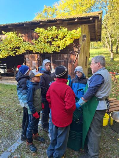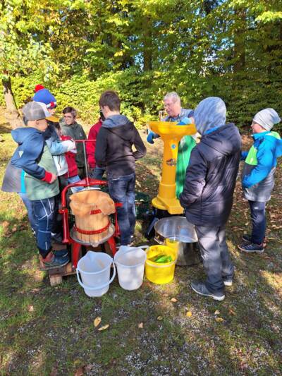 Der Herbst – eine Zeit, in der die Blätter der Bäume bunt werden und viele Früchte reif sind. Der Herbst ist geprägt von der Ernte und dem Blätterfall, was ihn zu einer bedeutenden Zeit im Jahreszyklus macht. Im Rahmen der Woche der Gesundheit und Nachhaltigkeit machte sich die 5. Klasse auf den Weg zum Hans-Geiselbrechtinger-Garten des Kreisverbandes Landshut in Siegerstetten. Der bereits 1984 eröffnete und ca. 11 000 m² große Lehrgarten umfasst umfangreiche Obstbaumanlage mit ca. 200 Bäumen, vor allem Äpfel, Birnen und Zwetschgen und zeigt mit rund 180 verschiedenen Sorten die große Vielfalt auf. Bei der Sortenauswahl wurden alte, bewährte Obstsorten bevorzugt. Nach einer kurzen Busfahrt wurden wir schon von Frau und Herrn Fischer erwartet. Frau Fischer schnappte sich einen Teil der Kinder und führte sie durch den Garten. Dabei erzählte sie viel über den Lebensraum Streuobstwiese, wies auf mögliche Gefahren und Krankheiten für die Bäume hin und ließ die Kinder in verschiedenen Stationen die Obstsorte Apfel genauer unter die Lupe nehmen. Wie unterscheiden sich die verschiedenen Apfelsorten nach Aussehen und Geschmack? Aus welchen Teilen besteht ein Apfel? Welche Schädlinge gibt es für den Apfel? Herr Fischer schickte währenddessen die andere Gruppe durch den Garten, um Äpfel und Birnen zu sammeln. Gemeinsam wurden die Früchte gewaschen und in den Schredder gefüllt. Dann ging es für die zerkleinerten Fruchtstücke in den Presskorb. Nach einer kurzen Brotzeitpause wurden die Gruppen getauscht, sodass zum Schluss unter körperlicher Höchstleistung mit der Hand ca. 50 Liter köstlichster Bio-Saft gepresst wurde.